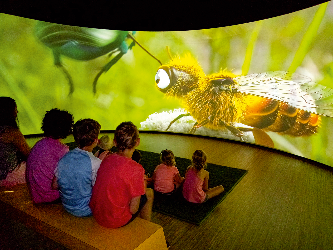 Enfilez votre plus belle paire d’ailes et devenez une abeille pour un jour grâce à un film d’animation projeté sur un écran de 210°.